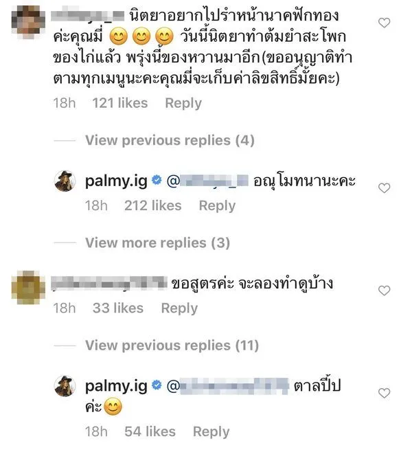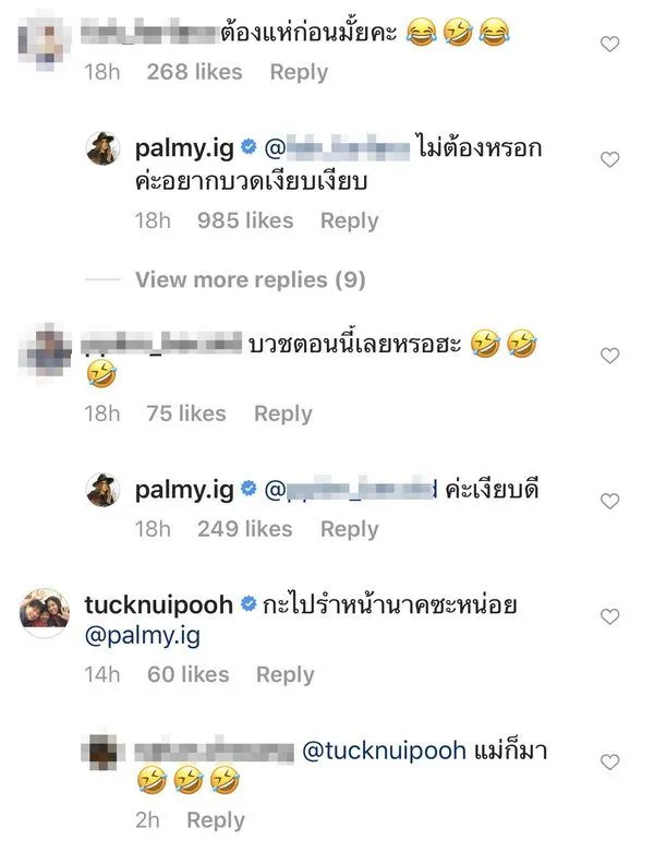 โดยสาวปาล์มมี่ ก็ได้โพสต์ภาพ พร้อมทั้งแคปชั่นระบุว่า “จะบวดละนะ” ความฮาจึงบังเกิดที่แฟนคลับที่น่ารักของสาว “ปาล์มมี่” ที่รู้ว่าเธอเป็นคนตลก เลยจัดคอมเมนต์กวนๆมาเป็นชุด เช่น.. “พรุ่งนี้เดินบาตรแถวไหนคะ สาธุบุญนะคะ” , “บวดนานไหมคับ” , “อยากไปรำหน้านาคฟักทองค่ะคุณมี่” , ต้องแห่ก่อนมั้ยคะ ฯลฯ