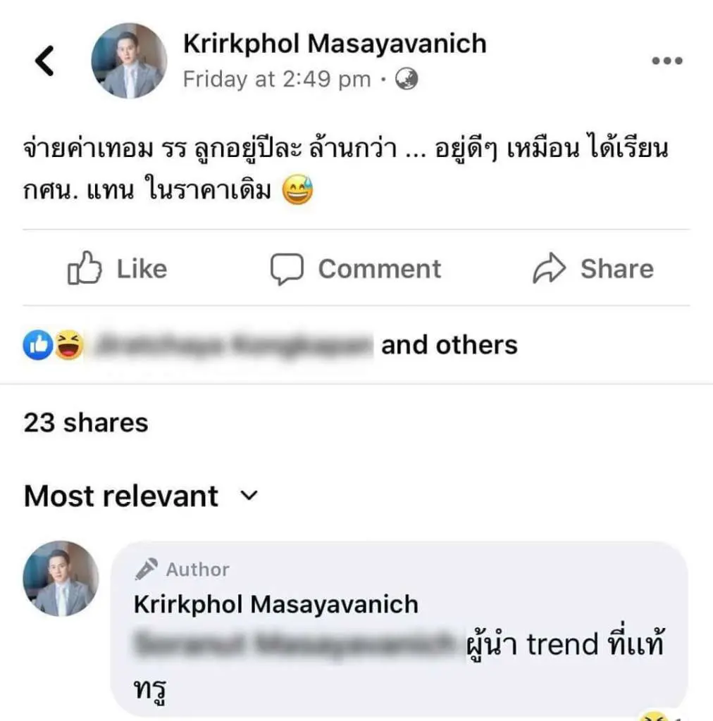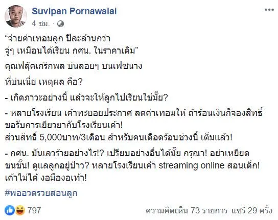 เกี่ยวกับเรื่องเดียวกันนี้ ผู้ใช้เฟซบุ๊ก Suvipan Pornawalai ได้ออกมาโพสต์เกี่ยวกับข้อความในไทม์ไลน์ของเฟซบุ๊ก ฟลุค เกริกพลว่า ““จ่ายค่าเทอมลูก ปีละล้านกว่า จู่ๆ เหมือนได้เรียน กศน. ในราคาเดิม” คุณฟลุค เกริกพล บ่นลอยๆ บนเฟซนาง ที่บ่นเนี่ย เหตุผล คือ?
