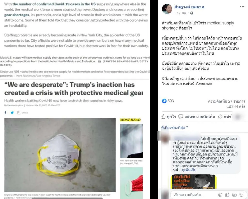 ขณะเดียวกัน ในเฟซบุ๊ก ของ อ.อัษฎางค์ ยมนาค ได้โพสต์ภาพพร้อมทั้งระบุข้อความอีกครั้งว่า “สำหรับคนที่อาจไม่เข้าใจว่า medical supply shortage คืออะไร เนื้อหาสรุปสั้นๆ ว่า ในวิกฤตโควิด หน้ากากอนามัย และอุปกรณ์การแพทย์ ขาดแคลนเหมือนกันทุกประเทศ ทั้งโลก ไม่ใช่เฉพาะในไทย แถมในบางประเทศขาดแคลนยิ่งกว่าในไทย มันยังมีอีกหลายอย่าง ที่ท่านอาจไม่เข้าใจ เพราะฉะนั้นใจเย็นๆ อย่าเพิ่งหัวร้อนนี่คือหลักฐาน ว่าในต่างประเทศขาดแคลนขนาดไหน สถานการณ์หนักกว่าไทยเยอะ”