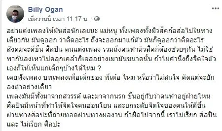 จนต่อมาภายหลัง บิลลี่ โอแกน ได้ออกมาโพสต์ข้อความถึงเพลงดังกล่าวว่า..อย่าแต่งเพลงให้มันส่อนักเลยนะ แม่หนู ทั้งเพลงทั้งมิวสิคก้อส่อไปในทางเดียวกัน มันดูออก ว่าคิดอะไร ถึงจะออกมาแก้ตัว มันก็ดูออกว่าคิดอะไร สังคมจะดีขึ้น ศิลปิน คนแต่งเพลง รวมถึงคนทำมิวสิคก็ต้องช่วยๆกัน ไม่ใช่พากันลงเหวไปคลุกเคล้ากิเลสอย่างเมามันขนาดนั้น ถ้าไม่คำนึงถึงจิตใจตัวเองก็ให้เห็นแก่เด็กๆบ้างได้ไหม ? เคยฟังเพลง บทเพลงเพื่อเด็กของ พี่เต๋อ ไหม หรือว่าไม่สนใจ คิดแต่จะยักลงต่ำอย่างเดียว เพลงมันมีทั้งมาจากสวรรค์ และมาจากนรก ขึ้นอยู่กับว่าคนทำอยู่ฝ่ายไหน ศิลปินมีหน้าที่ทำให้จิตใจคนอ่อนโยน และยกระดับจิตใจของคนให้ดีขึ้นผ่านทางศิลปะที่ถ่ายทอดผ่านทางผลงาน ถ้าผิดไปจากนี้ เราไม่เรียก ศิลปิน และ ไม่เรียก ศิลปะ