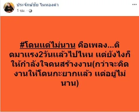 ล่าสุดวันนี้ ( 6 เมษายน 2563ฉ นายประจักษ์ชัย เนาวรัตน์ ผู้บริหารค่ายไหทองคำ เรกคอร์ด ก็ได้มีการโพสต์ข้อความผ่านเฟสบุ๊คระบุข้อความว่า…โดนเเต่ไม่นาน คือเพลง ติดมาเเรง2วันเเล้วไปไหน เเต่ยังไงก็ให้กำลังใจคนสร้างงาน(กว่าจะคิดงานให้โดนกะยากเเล้ว เเต่อยู่ไม่นาน)