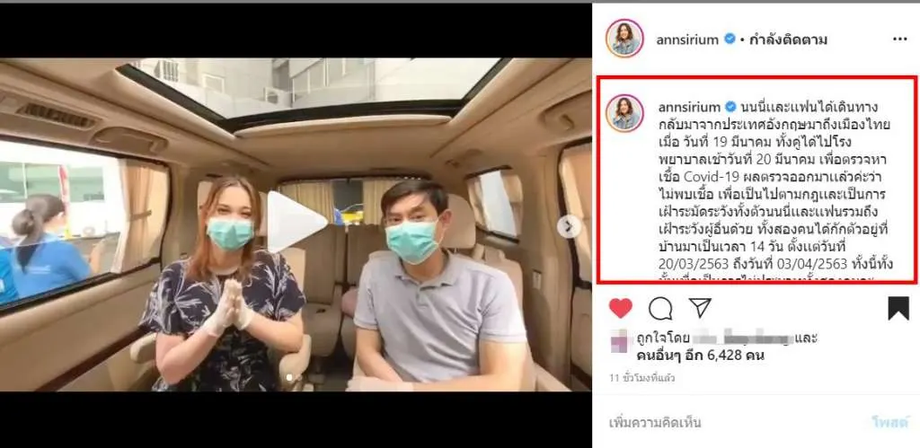 ซึ่งงานนี้ สาวแอน สิเรียม ก็ได้โพสต์ระบุข้อความว่า นนนี่เเละเเฟนได้เดินทางกลับมาจากประเทศอังกฤษมาถึงเมืองไทยเมื่อ วันที่ 19 มีนาคม ทั้งคู่ได้ไปโรงพยาบาลเช้าวันที่ 20 มีนาคม เพื่อตรวจหาเชื้อ Covid-19 ผลตรวจออกมาเเล้วค่ะว่า ไม่พบเชื้อ เพื่อเป็นไปตามกฎเเละเป็นการเฝ้าระมัดระวังทั้งตัวนนนี่เเละเเฟนรวมถึงเฝ้าระวังผู้อื่นด้วย ทั้งสองคนได้กักตัวอยู่ที่บ้านมาเป็นเวลา 14 วัน ตั้งเเต่วันที่ 20/03/2563 ถึงวันที่ 03/04/2563 ทั้งนี้ทั้งนั้นเพื่อเป็นการไม่ประมาททั้งสองคนจะคอยสังเกตอาการเเละระมัดระวังตัวเองต่อไปค่ะ (: #เป็นกำลังใจให้กับบุคลากรทางการเเพทย์และเจ้าหน้าที่ทุกคนด้วยนะคะ