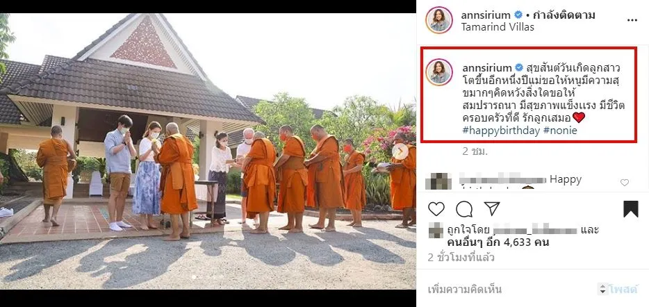เเละล่าสุด สาวแอน สิเรียม นั้นก็ได้พาครอบครัวทำบุญวันเกิด นนนี่ หลังลูกสาว-ลูกเขย ตรวจไม่พบเชื้อโควิด-19 โดย สาวแอน สิเรียม ได้โพสต์ระบุข้อความว่า