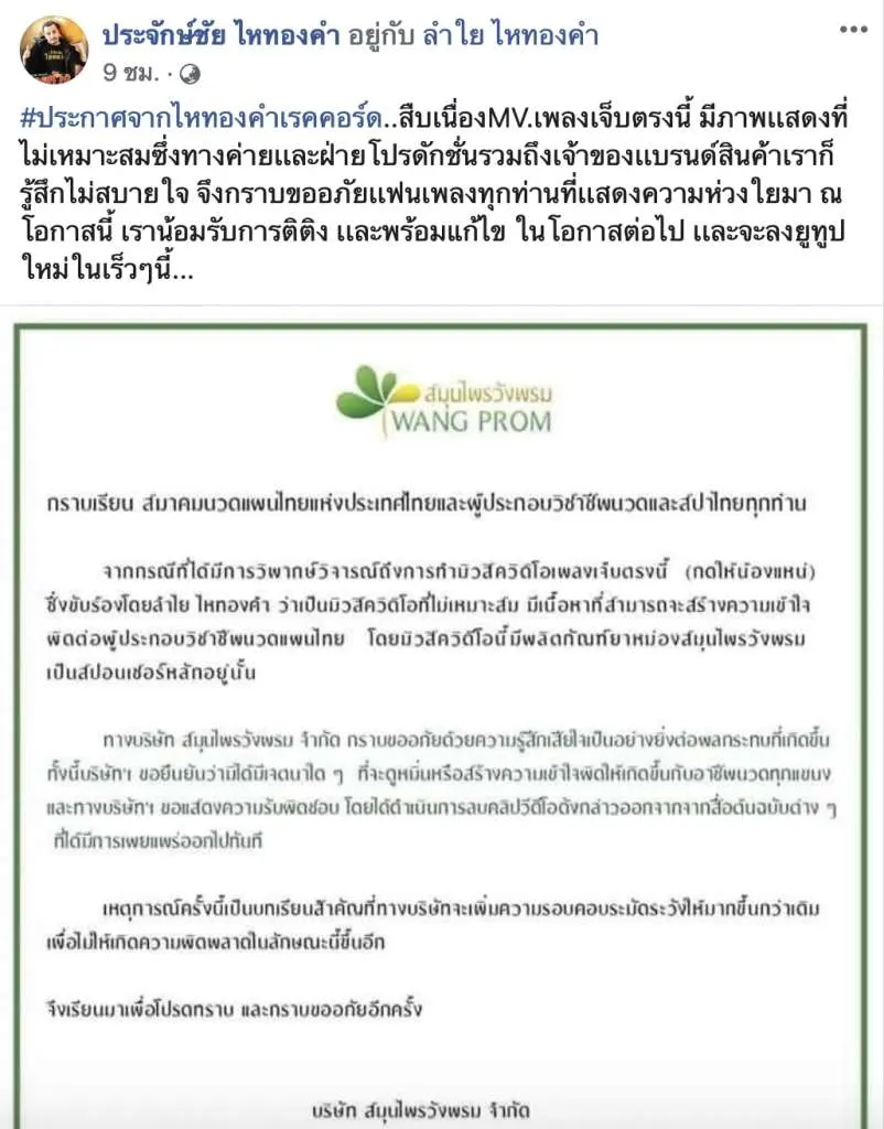 ภายหลังทางด้านค่ายไหทองคำก็ได้ตัดสินใจลบ MV เพลงดังกล่าวออกจากช่องยูทูปไปหลังโดนถล่มด่าอย่างหนักเลยทีเดียว
