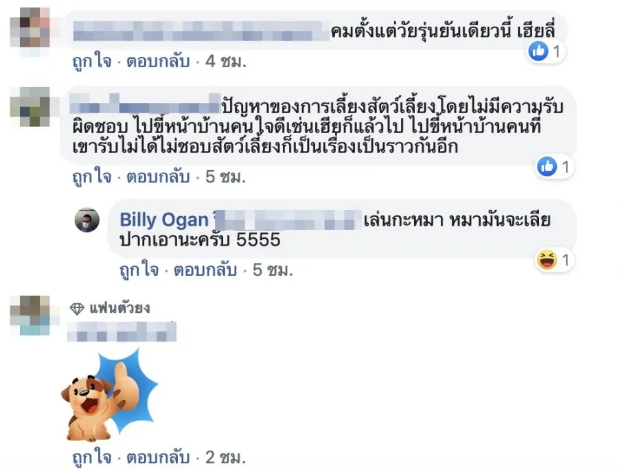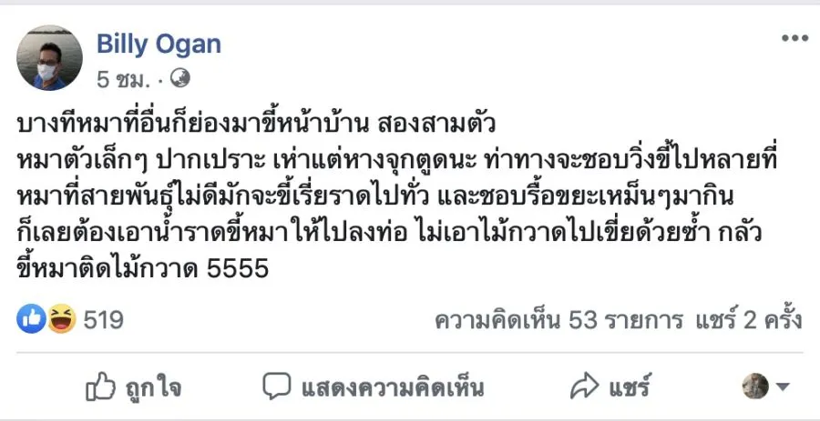 ล่าสุดทางด้าน บิลลี่ โอแกน ก็ได้ออกมาโพสต์ข้อความอีกครั้งเอาไว้ว่า บางทีหมาที่อื่นก็ย่องมาขี้หน้าบ้าน สองสามตัว หมาตัวเล็กๆ ปากเปราะ เห่าแต่หางจุกตูดนะ ท่าทางจะชอบวิ่งขี้ไปหลายที่ หมาที่สายพันธุ์ไม่ดีมักจะขี้เรี่ยราดไปทั่ว และชอบรื้อขยะเหม็นๆมากิน ก็เลยต้องเอาน้ำราดขี้หมาให้ไปลงท่อ ไม่เอาไม้กวาดไปเขี่ยด้วยซ้ำ กลัวขี้หมาติดไม้กวาด 5555 ซึ่งงานนี้ก็ไม่รู้ว่าจะเกี่ยวข้องกับเหตุการณ์ดังกล่าวอีกหรือไม่ แต่ที่นี้ๆบรรดาขาเผือกนั้นถึงกับต่อมกระตุกกันรัวๆเลยจ้า