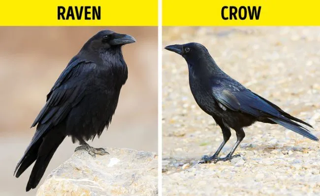 -นกราเวน (นกจำพวกอีกา) และอีกาเป็นนกที่แตกต่างกันแม้ว่าพวกมันจะดูคล้ายกัน นกราเวนมีขนาดใหญ่ขึ้นมีหางและปีกที่แหลมยาวกว่า และมีขาที่แข็งแรงกว่า ส่วนกามีขนาดเล็กกว่าและมีหางสั้นหรือหางเป็นรูปสี่เหลี่ยม © astute_newt / Reddit