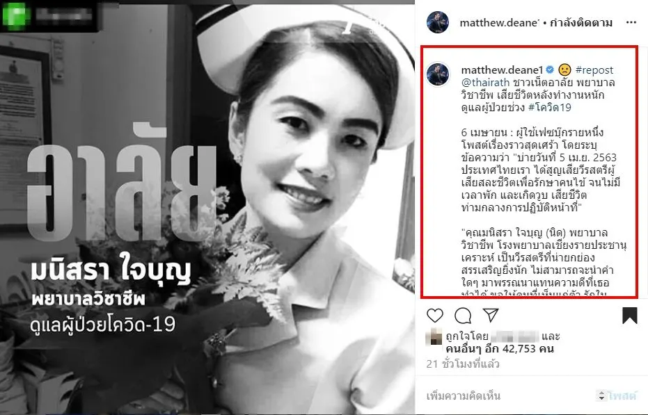 เเละล่าสุด หนุ่มแมทธิว ดีน นั้นก็ได้โพสต์อาลัยถึง พยาบาลสาว หลังเสียชีวิตในหน้าที่ หลังทุ่มเทเวลาเพื่อดูแลผู้ป่วยโควิด 19 ซึ่งงานนี้ หนุ่มแมทธิว ดีน ได้รีโพสต์ของสำนักข่าวชื่อดังว่า #repost @thairath ชาวเน็ตอาลัย พยาบาลวิชาชีพ เสียชีวิตหลังทำงานหนัก ดูแลผู้ป่วยช่วง #โควิด19 6 เมษายน : ผู้ใช้เฟซบุ๊กรายหนึ่งโพสต์เรื่องราวสุดเศร้า โดยระบุข้อความว่า “บ่ายวันที่ 5 เม.ย. 2563 ประเทศไทยเรา ได้สูญเสียวีรสตรีผู้เสียสละชีวิตเพื่อรักษาคนไข้ จนไม่มีเวลาพัก และเกิดวูบ เสียชีวิต ท่ามกลางการปฏิบัติหน้าที่”