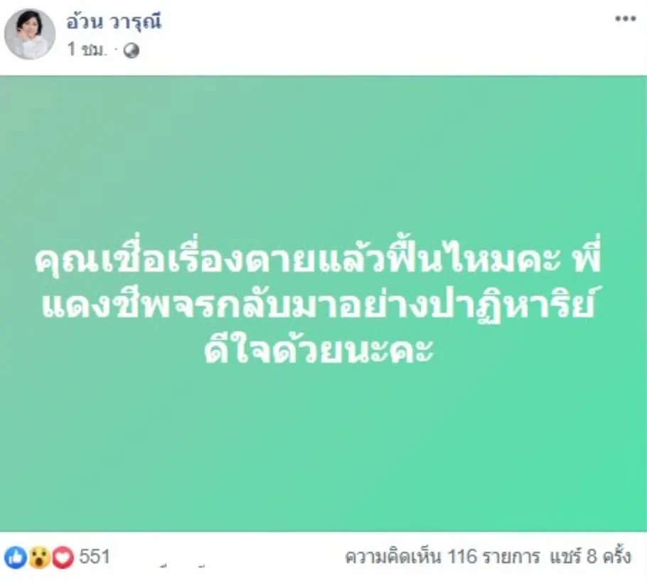 แต่ทว่าล่าสุด “ตู้ ดิเรก” ได้โพสต์ว่า “ดีใจต่อการกลับมาของพี่แดงอีกครั้ง พี่แดงฟื้นคืนชีพขึ้นมาอีกครั้งหนึ่ง”