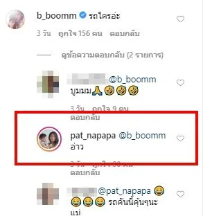 ล่าสุดทางด้าน สาวแพท ได้ออกมาโพสต์รูปภาพคู่กับลูกชาย น้องเรซซิ่ง แต่งานนี้กลับทำเอาชาวเน็ตโฟกัสผิดจุด เพราะรถข้างหลัง BMW นั้นไม่ใช่รถของ สาวแพท ซึ่งงานนี้ทางด้านเพื่อนสนิทอย่าง บูม สุภาพร วงษ์ถ้วยทอง จึงได้เข้ามาจับโป๊ะกลางไอจีของ สาวแพท เอาไว้ว่า รถใครอ่ะ ซึ่ง สาวแพท ได้เข้ามาตอบกลับว่า อ่าว