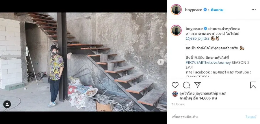 ก่อนหน้านี้ บอย เพิ่งโพสต์ขณะไปดูเรือนหอกำลังก่อสร้าง พร้อมแคปชั่นติดตลกว่า ผ่านมาแล้วทุกวิกฤต @jeab_pijittra ขอเป็นกำลังใจให้ทุกๆคนด้วยครับ