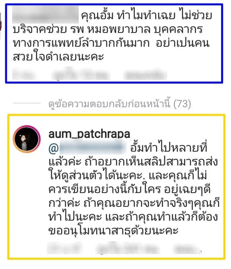 จากกรณีที่มีกระแสให้พูดถึง เมื่อสาวอั้ม พัชราภา โพสต์ภาพอาหารเต็มโต๊ะ แต่กลับมีชาวโซเชียลถามถึงการบริจาคเงินช่วยเหลือโรงบาล ว่าทำไมยังไม่เห็นข่าวอั้มบริจาคเงินช่วยเหลือเหมือนคนอื่นๆ จนอั้มต้อองออกมาจากคอมเมนต์กลับว่า อั้มทำไปหลายที่แล้วค่ะ ถ้าอยากเห็นสลิปสามารถส่งให้ดูส่วนตัวได้นะคะและคุณก็ไม่ควรเขียนอย่างนี้กับใคร อยู่เฉยๆดีกว่าค่ะ ถ้าคุณอยากจะทำจริงๆ คุณก็ทำไปนะคะ และถ้าคุณทำแล้วก็ต้องขออนุโมทนาสาธุด้วยนะคะ