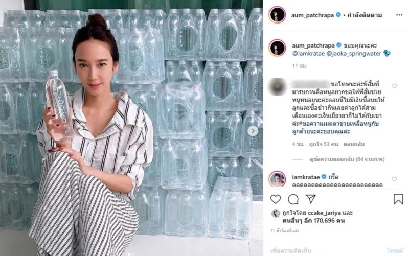 ล่าสุดในอินสตาแกรมของสาวอั้ม ก็ได้มีการลงรูปโปรโมทน้ำดื่มที่สาว กระแต ศุภักษรส่งไปให้ ซึ่งหลังจากสาวอั้มลงรูปดังกล่าวไป ก็มีชาวโซเชียลคนหนึ่งเข้ามาคอมเมนต์ว่า พี่อั้ม หนูรบกวน ขอข้าวสาร มาม่า อย่างละถุงได้มั้ยคะ ตอนนี้ ไม่มีงานทำค่ะ ขอบพระคุณค่ะ