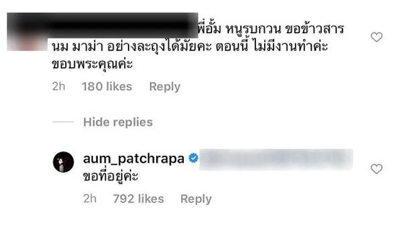 "อั้ม พัชราภา" ขอที่อยู่หลังแฟนคลับ เม้นต์ขอข้าวสาร