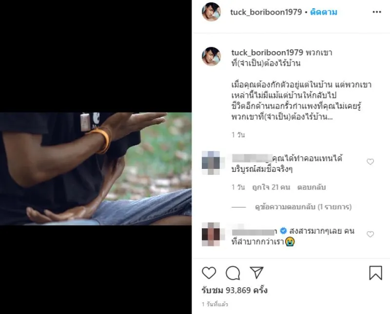เชื่อว่าหลายคนคงรู้จักกันเป็นอย่างดี สำหรับดาราตลก และพิธีกรชื่อดังอย่าง หนุ่ม ตั๊ก บริบูรณ์ ที่ล่าสุดทำแฟนคลับเข้ามาคอมเม้นท์ รัวๆ หลังเจ้าตัว ได้โพสต์ไอจีรวมเรื่องเล่าของผู้ที่ประสบปัญหาจากการเกิด covid19 ที่หลายคนต้องเจอซึ่งหนักสุดจากคนที่มีบ้าน ต้องกลายเป็นคนไร้บ้าน