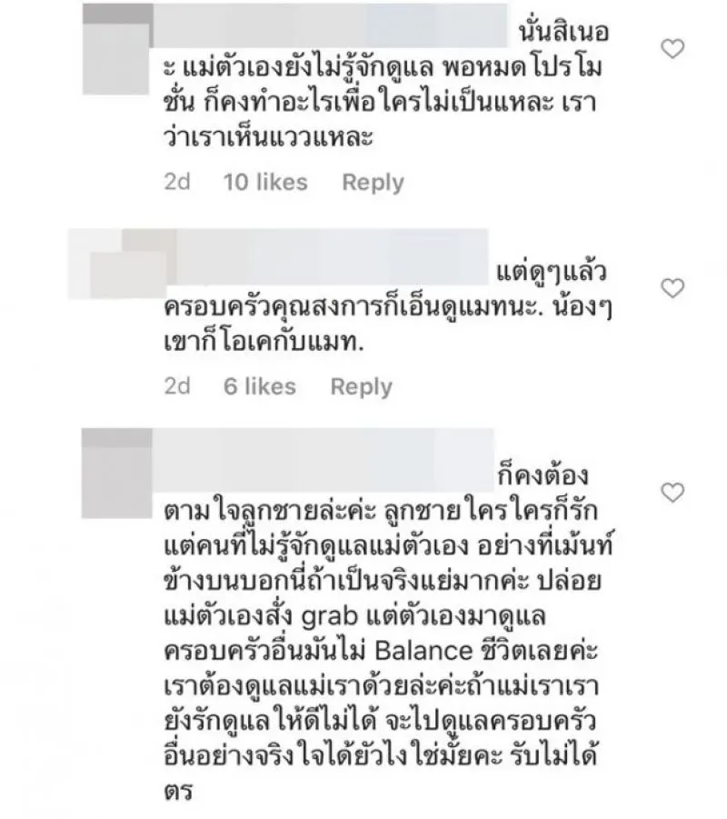 ซึ่งได้มีผู้คนมาคอมเมนต์ต่อว่า นั่นสิเนอะ แม่ตัวเองยังไม่รู้จักดูแล พอหมดโปรโมชั่นก็คงทำอะไรเพื่อใครไม่เป็นแหละ เราว่าเราเห็นแววแหละ เรียกว่าโดนตามว่าทุกที่จริงๆ เลยสาวแมท