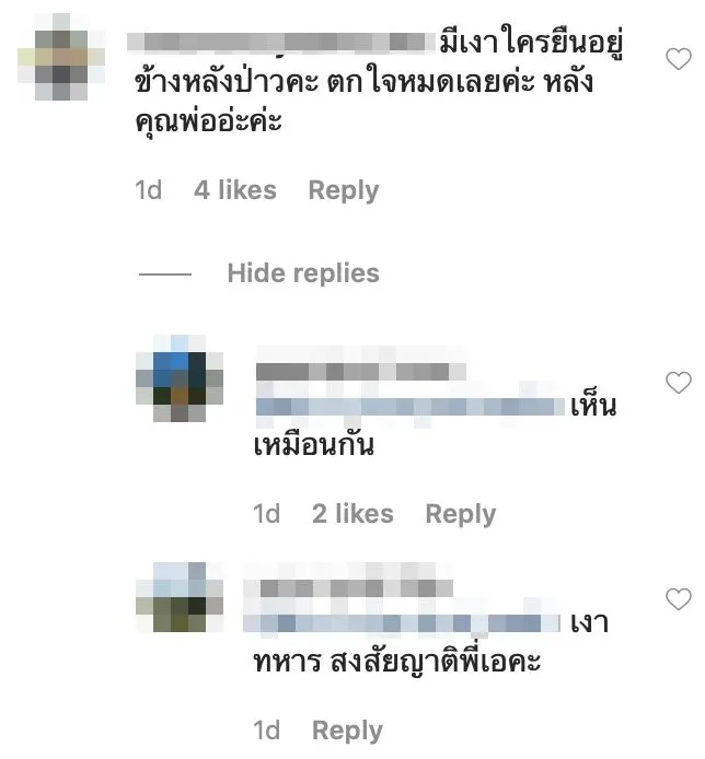 แต่งานนี้กลับทำเอาชาวเน็ตโฟกัสผิดจุด โดยได้มีชาวเน็ตรายหนึ่งได้เข้าไปคอมเมนต์ใต้รูปดังกล่าวเอาไว้ว่า มีใครยืนอยู่ข้างหลังป่าวคะ ตกใจหมดเลยค่ะ หลังคุณพ่ออ่ะค่ะ เมื่อซูมเข้าไปก็จะเห็นว่าคล้ายกับมีเงาอยู่ด้านหลัง