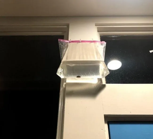 “ ถุงน้ำที่มีเหรียญอยู่ข้างในวางไว้เหนือประตูร้านในแคลิฟอร์เนีย”