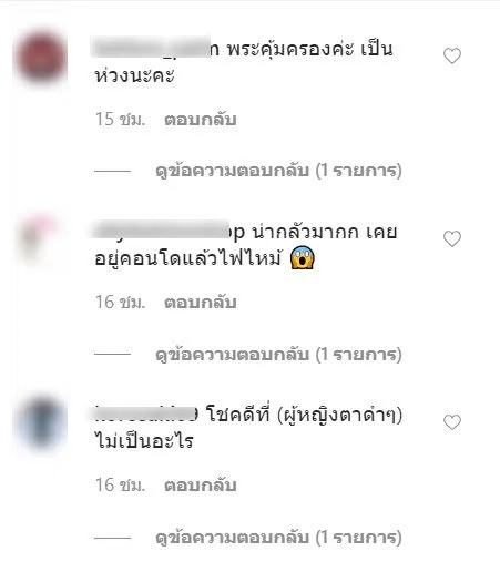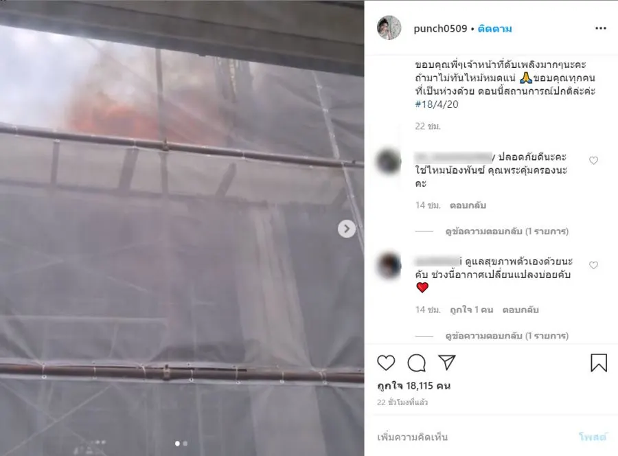"ตอนที่ถ่ายคือกลัวมากจริงๆ มือสั่น เสียงสั่น พอถ่ายเสร็จก็รีบเก็บของที่จำเป็นสำคัญๆ แล้วก็วิ่งลงข้างล่างเลย ตอนนี้ไฟดับเรียบร้อยแล้ว ขอบคุณพี่ๆ เจ้าหน้าที่ดับเพลิงมากๆ นะคะ ถ้ามาไม่ทันไหม้หมดแน่ ขอบคุณทุกคนที่เป็นห่วงด้วย ตอนนี้สถานการณ์ปกติล่ะค่ะ #18/4/20" ซึ่งก็มีชาวเน็ตมากดไลค์ และส่งความห่วงใยถึงสาวพั้นช์ตลอด