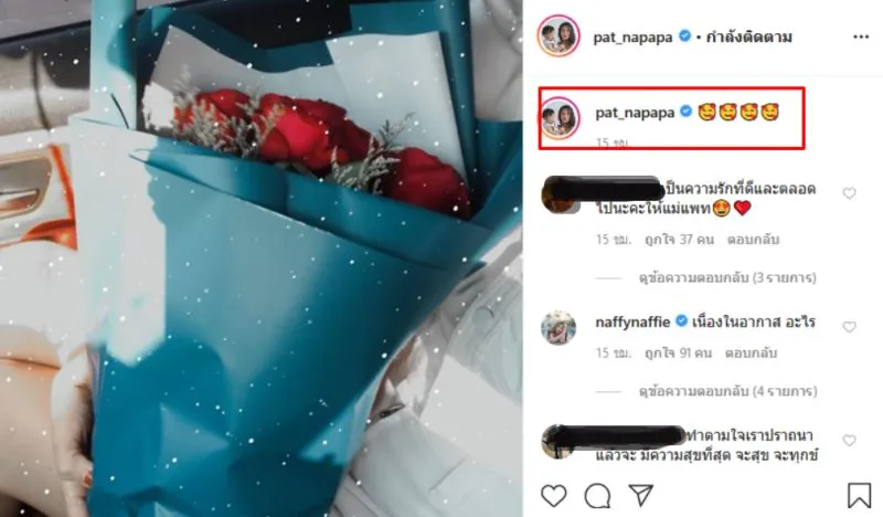 และล่าสุด สาว แพท ณปภา ก็ได้โพสต์ภาพลงไอจีส่วนตัวดอกกุหลาบสีแดงช่อโต พร้อมกับระบุแคปชั่นโดย มีรูปหน้ายิ้มหัวใจหลายดวงเลยทีเดียว ซึ่งทำเอาเหล่าบรรดาแฟนๆ แห่เข้าคอมเมนต์อวยพร และยินดีกับสาว แพท ณปภากันรัวๆ เลยค่ะ