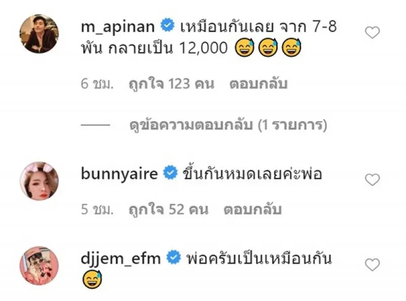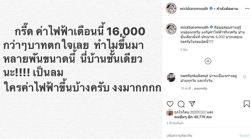 หลังจากที่ มิค บรมวุฒิ โพสต์ข้อความดังกล่าวออกไปต่างมีเพื่อนดาราและแฟนคลับเข้ามาคอมเมนต์กันมากมาย โดยบอกว่า ค่าไฟฟ้าที่บ้านก็ขึ้นเช่นเดียวกัน บางคนจาก 1 พันเป็น 4 พันบาทเลยทีเดียว พร้อมกับตั้งคำถามว่าเกิดอะไรขึ้น ทำไมค่าไฟถึงได้แพงขึ้นขนาดนี้