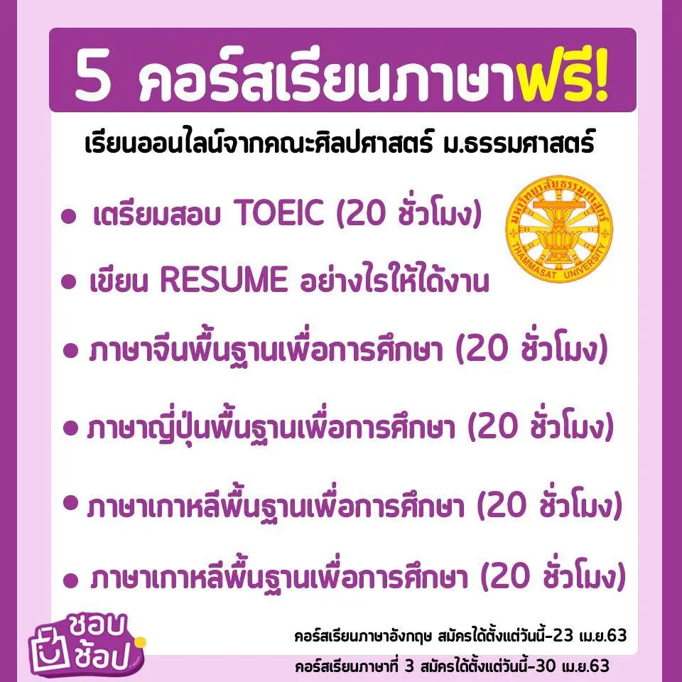 อบรมภาษาเพื่ออนาคตกับ 5 คอร์สจุกๆ จากคณะศิลปศาสตร์ ม.ธรรมศาสตร์กันจ้า ง่ายๆ เพียงแค่เลือกคอร์สที่สนใจ กรอกรายละเอียดตามลิงค์ที่แนบให้ ทางคณะจะเลือกผู้โชคดีรับสิทธิ์เข้าเรียน (ประกาศรายชื่อผู้มีสิทธิ์เข้าเรียนวันที่ 2 พ.ค.63)