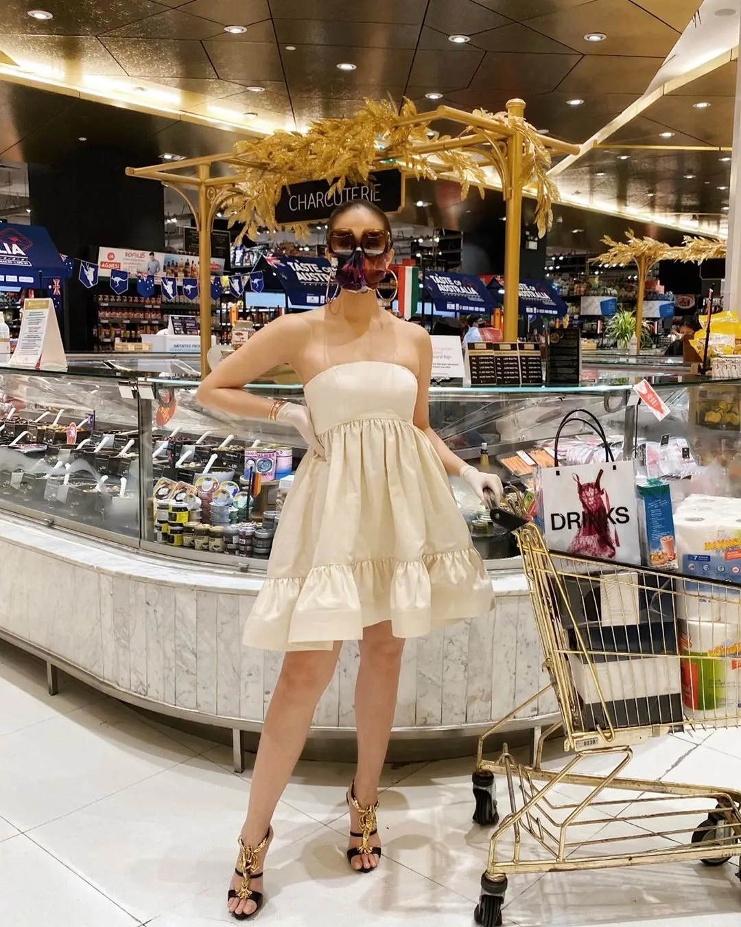 คงคอนเซ็ปต์สายเซ็กซี่ เมื่อ “คริส หอวัง” ต้องเข้าซูเปอร์มาร์เก็ตตุนเสบียง นอกจากหน้ากากผ้าสีดำแล้ว เธอใส่ชุดเดรสรัดรูป ปลดกระดุมข้างผ่าสูง อีกด้วย