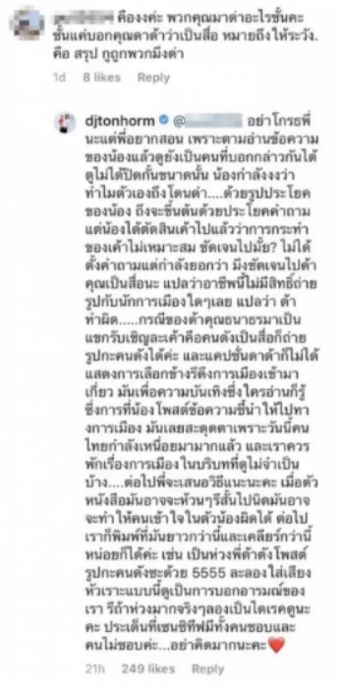 จนดีเจต้นหอมทนไม่ไหว คอมเม้นต์ดีเจด้าด้าทันที อย่าโกรธพี่นะแต่พี่อยากสอน เพราะตามอ่านข้อความของน้องแล้วดูยังเป็นคนที่บอกกล่าวกันได้ดูไม่ได้ปิดกั้นขนาดนั้น น้องกำลังงงว่าทำไมตัวเองถึงโดนด่า ด้วยรูปประโยคของน้อง ถึงจะขึ้นต้นด้วยประโยคคำถามแต่น้องได้ตัดสินเค้าไปแล้วว่าการกระทำของเค้าไม่เหมาะสม ชัดเจนไปมั้ย ไม่ได้ตั้งคำถามแต่กำลังยอกว่า ชัดเจนไปด้า คุณเป็นสื่อนะ แปลว่าอาชีพนี้ไม่มีสิทธิ์ถ่ายรูปกับนักการเมืองใดๆเลย แปลว่า ด้า ทำผิด กรณีของด้าคุณธนาธรมาเป็นแขกรับเชิญละเค้าคือคนดังเป็นสื่อก็ถ่ายรูปกะคนดังได้ค่ะ และแคปชั่นดาด้าก็ไม่ได้แสดงการเลือกข้างรึดึงการเมืองเข้ามาเกี่ยว มันเพื่อความบันเทิงซึ่งใครอ่านก็รู้