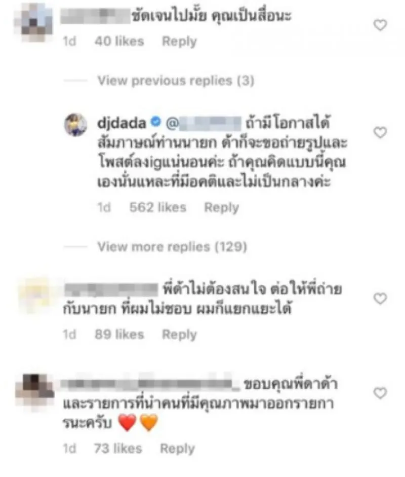 ชาวเน็ตเดือด หลัง ดีเจด้าด้า โพสต์ภาพลงอินสตาแกรม คู่ ธนาธร จึงรุ่งเรืองกิจ โดยได้ระบุข้อความว่า ฟ้ารักพ่อค่ะ หลังจากนั้นก็มีชาวเน็ตเข้ามาคอมเม้นต์ว่า ชัดเจนไปมั้ย คุณเป็นสื่อนะ เจอถูกตำหนิเป็นสื่อชัดเจนไปมั้ย ก่อนชาวเน็ตจะรุมถล่ม เจ้าของคอมเมนต์ดังกล่าว ขณะที่ดีเจดาด้าเข้ามาคอมเมนต์ตอบว่า ถ้ามีโอกาสได้สัมภาษณ์ท่านายก ด้าก็จะขอถ่ายรูปและโพสต์ลง ig แน่นอนค่ะ ถ้าคุณคิดแบบนี้คุณเองนั่นแหละที่มีอคติและไม่เป็นกลางค่ะ
