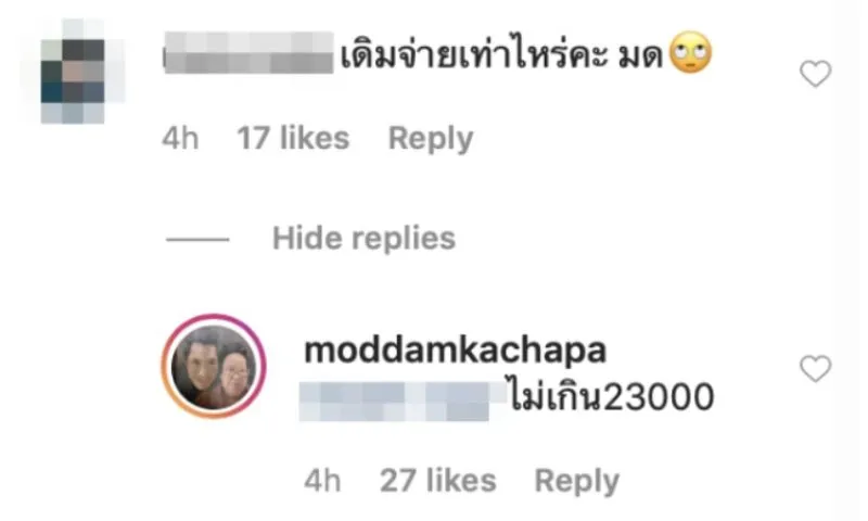 ซึ่งงานนี้ก็ได้มีคนเข้าไปถามว่า เดิมจ่ายเท่าไหร่คะ มด ทางด้าน มดดำ ได้ตอบว่า ไม่เกิน23000 เรียกได้ว่าถึงช็อกจนพูดไม่ออกเมื่อเจอกับตัวเอง