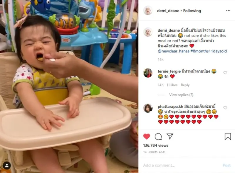 เรียกได้ว่าตั้งแต่ออก รพ. มาก็มีแต่ความสุขอยู่กับลูกกับครอบครัว จนมีคลิปความน่ารักของน้อง เดมี่ ออกมาให้ฟินในความน่ารักตลอดๆ คุณแม่ลีเดีย ศรัณย์รัชต์ ที่ช่วงนี้ก็โชว์คลิปให้เราได้ดูกันเป็นประจำ คนที่กำลังเครียดเห็นความน่ารักของ น้องหนูเดมี่ แล้วก็ช่วยให้ยิ้มได้บ้าง ช่วงก่อนคุณยายอวดคลิปน้องเดมี่ทานข้าว ซึ่งน้องเดมี่ก็ทานอย่างเอร็ดอร่อย แถมยังทำหน้าน่ารักให้เราได้ดูด้วย เรียกได้ว่ามื้อเย็นที่คุณยายเตรียมให้ถูกใจหนูน้อยสุดๆ แต่พีคสุดคือ คลิปล่าสุดนี้ล่ะ ต้องบอกเลยว่าสีหน้าตรงกันข้ามที่คุณยายทำจริงๆ เพราะหนูน้อยไม่อยากจะทานข้าว แถมพอทานเข้าไปก็ทำหน้าแบบแปลกๆ พอจะป้อนอีกคำก็ดูเหมือนไม่อยากกิน เล่นเอาคุณแม่ลีเดีย ถามยกใหญ่ว่ามันเป็นยังไงจ๊ะ 555