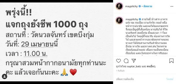 เมื่อวันที่ 28 เมษายน 2563 ใน อินสตาแกรมส่วนตัวของ เมย์ พิชญ์นาฏ นักแสดงสาวชื่อดัง ได้โพสต์ข้อความประกาศว่า ตนเองนั้น จะแจกถุงยังชีพเป็นจำนวน 1,000 ถุง ในวันที่ 29 เมษายน 2563 ที่วัดนวลจันทร์ เขตบึงกุ่ม ตั้งแต่เวลา 11 โมงเป็นต้นไป โดยระบุข้อความว่า
