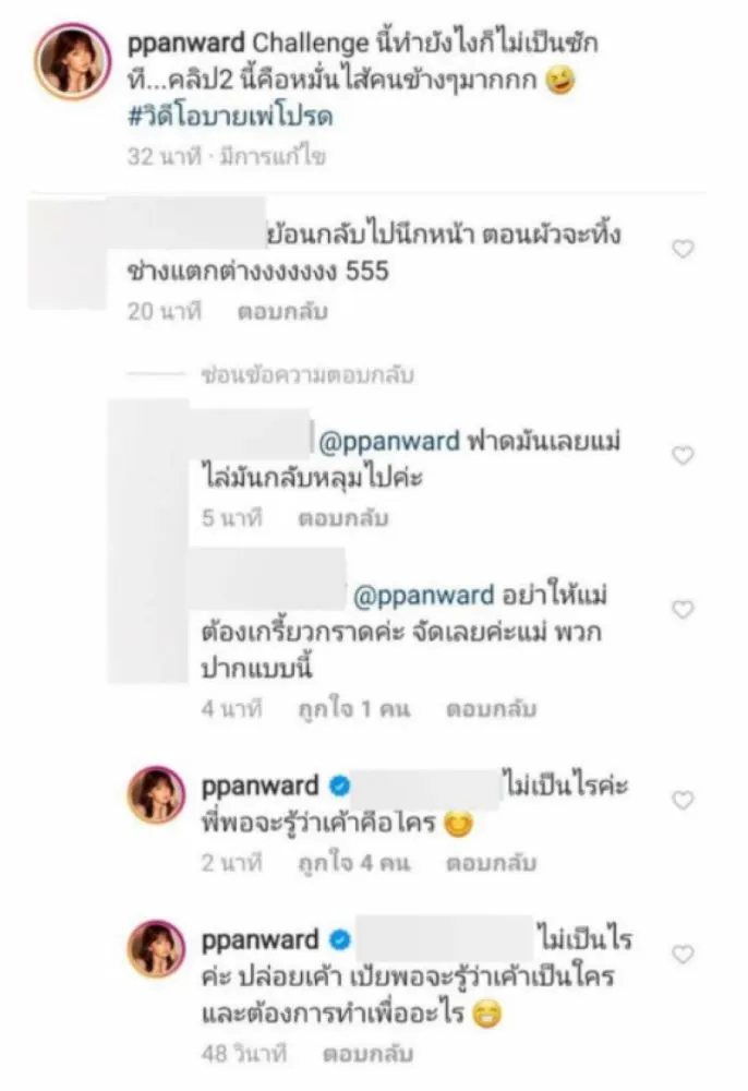 ล่าสุดมีคอมเม้นท์ ชาวโซเชียลท่านหนึ่งดันไปสะกิดแฟนคลับ ทำให้แฟนคลับไม่ยอม รวมกันต่อว่า ชาวโซเชียลรายนั้น แต่สาวเป้ย ก็ตอบเพียงว่า ไม่เป็นไรค่ะ พอจะรูว่าเค้าเป็นใคร