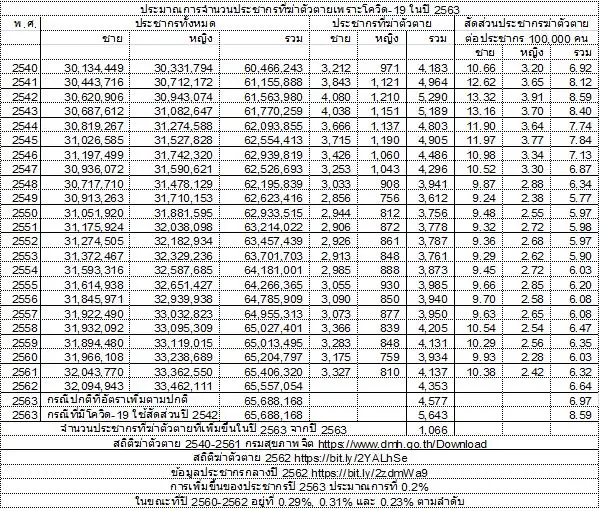 4. อย่างไรก็ตามโดยที่มีวิกฤติโควิด-19 น่าจะทำให้อัตราการฆ่าตัวตายมากกว่าปกติ โดยเฉพาะในช่วง 1-2 เดือนที่ผ่านมา มีข่าวคราวการฆ่าตัวตายเพราะเหตุนี้ถี่มาก ในที่นี้จึงใช้อัตรา 8.59 คนต่อประชากร 100,000 คนเช่นในปี 2542 ซึ่งเป็นอัตราสูงสุดในช่วงวิกฤติเศรษฐกิจ 2540-2543