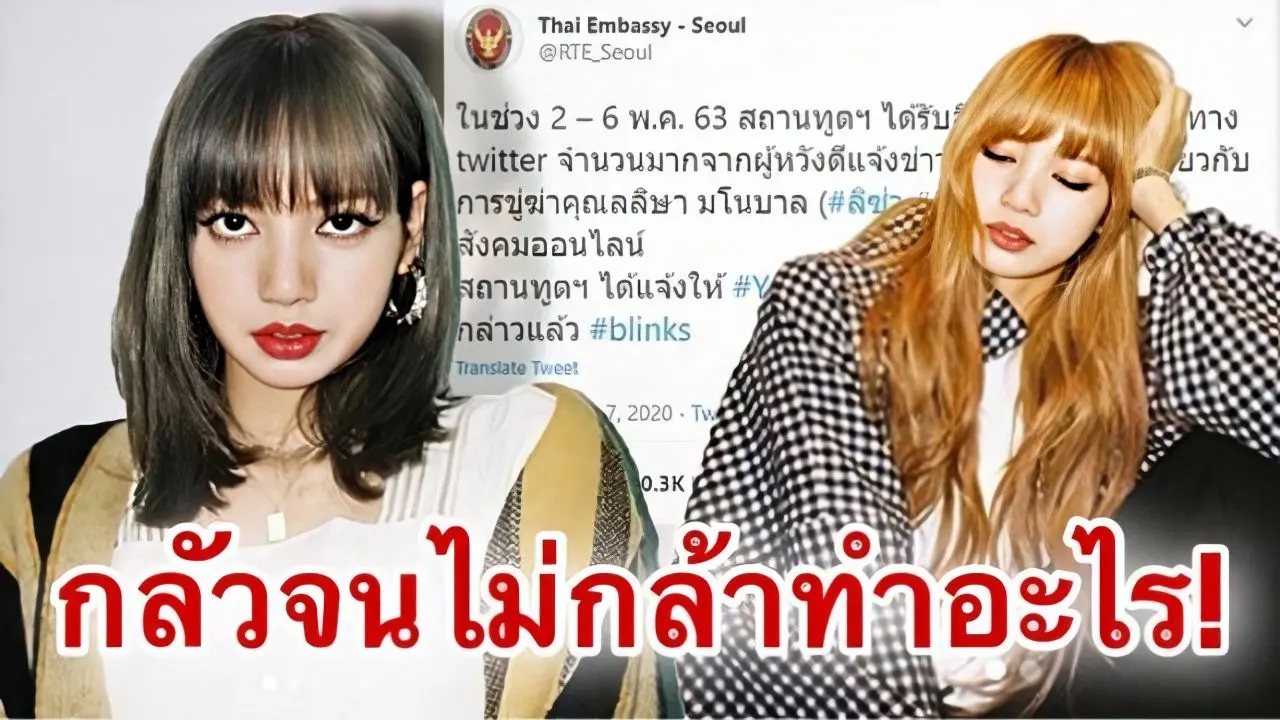 ขนหัวตั้งไม่หาย “ลิซา ลลิษา มโนบาล” นักร้องสาวไทยจากเกิร์ลกรุ๊ปชื่อดัง “Black Pink” หลังโดนขู่ฆ่า เดือดร้อนถึงสถานทูตไทยในกรุงโซล ตัอง ประสานต้นสังกัด YGEntertainment เพื่อหวังเพิ่มมาตรการคุ้มกันอย่างเร่งด่วน