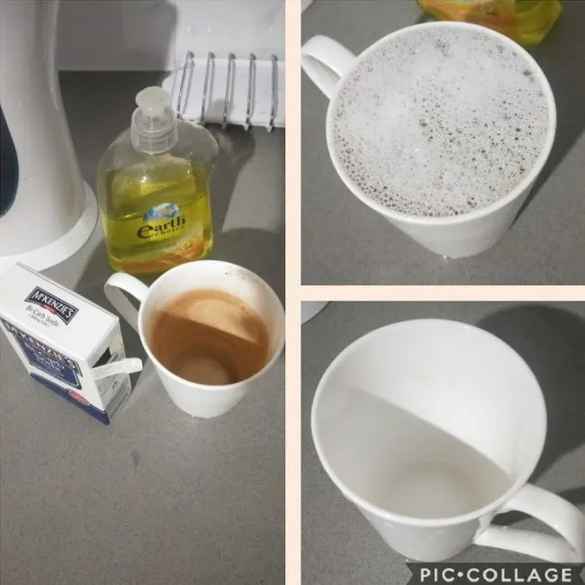 -ผสมเบกกิ้งโซดาเล็กน้อยกับน้ำยาล้างจานในแก้ว -เติมน้ำเดือดลงในส่วนผสม -รอ 5 นาทีแล้วล้างแก้วออก