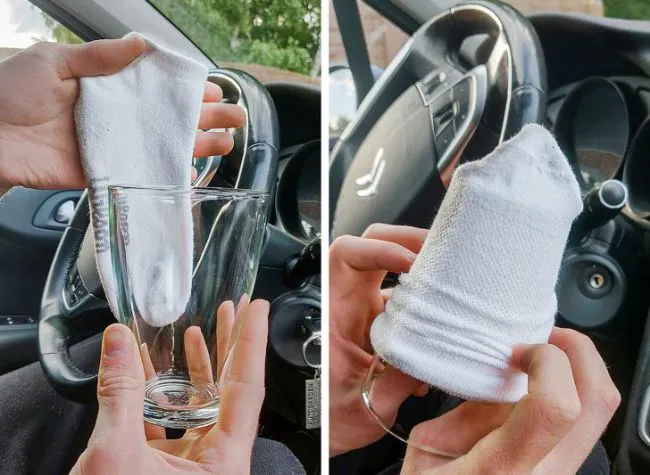 -ใส่ถุงเท้าไว้ที่ก้นแก้ว -สเปรย์น้ำยาทำความสะอาดบนถุงเท้า -ใส่แก้วกับถุงเท้าในที่วางแก้วของรถแล้วบิดสองสามครั้งเพื่อกำจัดฝุ่น -ทำซ้ำหลายครั้งจนกระทั่งที่วางแก้วสะอาด