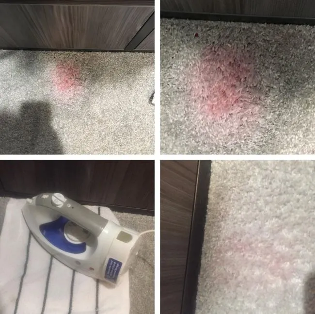 -เปิดเตารีด-ผสมแอมโมเนียและน้ำร้อนในสัดส่วน 1: 1 ในขวดสเปรย์ เขย่าส่วนผสมเพื่อรวมส่วนผสมเข้าด้วยกัน-ฉีดส่วนผสมลงบนรอยเปื้อนใส่ผ้าขนหนูด้านบนแล้วกดด้วยเตารีดร้อน-ย้ายเตารีดไปวางบนผ้าเช็ดตัว ตรวจสอบดูว่ามีการลบคราบหรือไม่ ถ้าไม่ – พ่นส่วนผสมเพิ่มเติมคลุมด้วยผ้าขนหนูและทำตามขั้นตอนต่อไปด้วยเตารีด-ทำซ้ำหลายครั้งโดยใช้ผ้าขนหนูใหม่ – อาจใช้ผ้าขนหนู 2-3 ผืนเพื่อลบคราบ