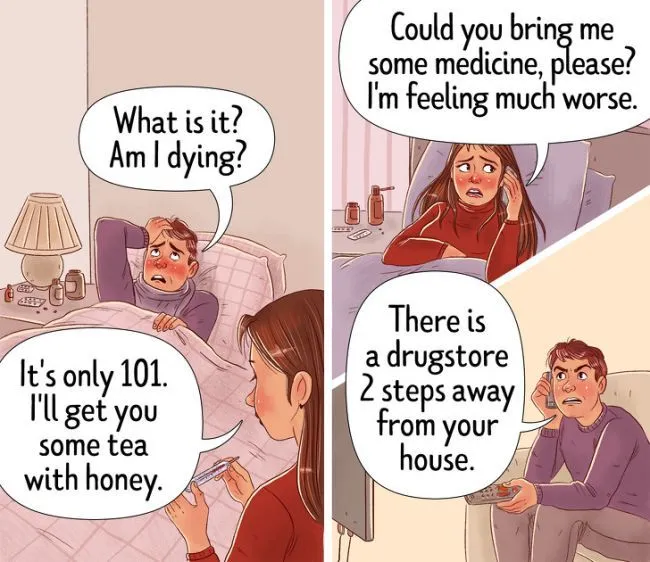 รูปซ้าย ผู้ชาย ” ฉันแย่แล้ว” ผู้หญิง “มันแค่มีไข้เอง จิบชามะนาวก็พอ”