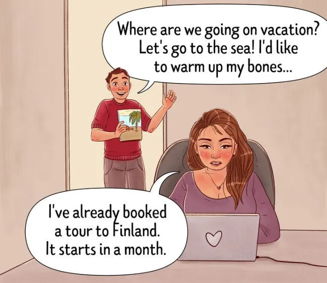 ผู้ชาย”ไปเที่ยววันหยุดกันเหอะ ไปทะเล ฉันอยากผ่อนคลาย” ผู้หญิงฉันจองทริปต่างประเทศแล้วไปเดือนหน้า”