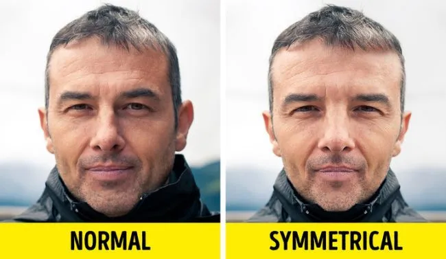 ไม่มีใครมีใบหน้าที่สมมาตรเท่ากันเป๊ะจริงๆแน่นอน ดังนั้นเมื่อคุณมองภาพในกระจก และ ภาพถ่ายจึงให้ความรู้สึกที่ไม่เหมือนกัน จากภาพตัวอย่างด้านซ้ายจะเป็นภาพปรกติ ด้านขวาเป็นภาพที่เราทำให้ คิ้วตาจมูกปากสมมาตรกัน 100% คุณลองดูสิว่ามันให้ความรู้สึกคนละแบบกันเลยว่าไหม