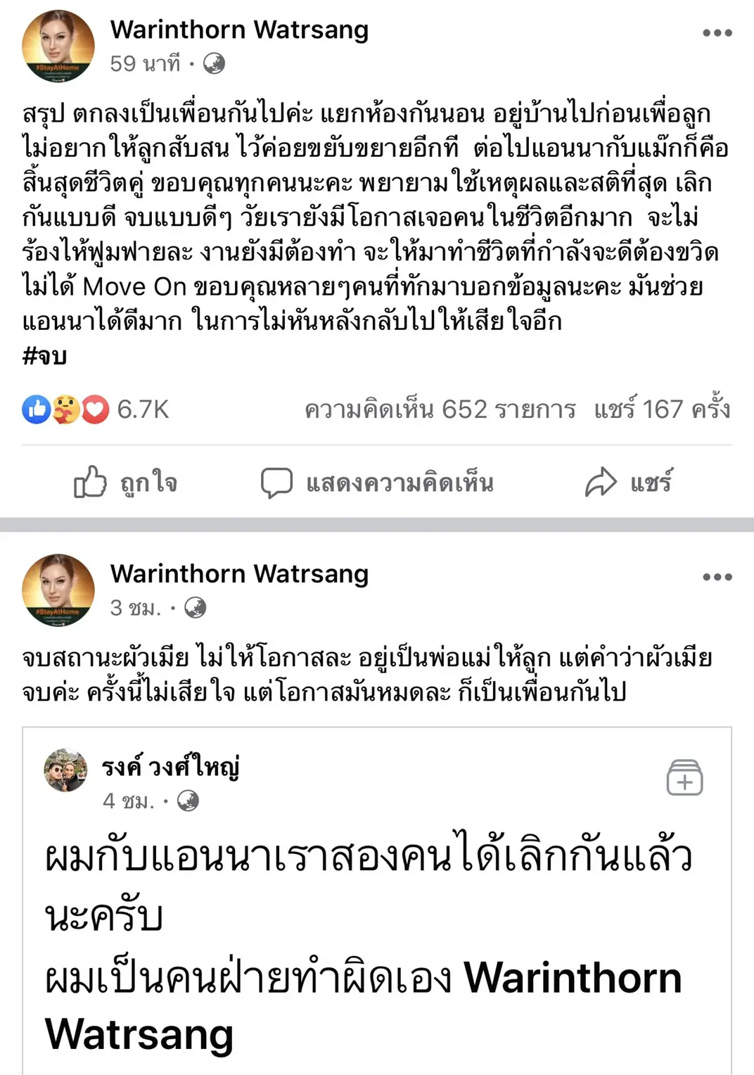 "จบสถานะผัวเมีย ไม่ให้โอกาสละ อยู่เป็นพ่อแม่ให้ลูก แต่คำว่าผัวเมียจบค่ะ ครั้งนี้ไม่เสียใจ แต่โอกาสมันหมดละ ก็เป็นเพื่อนกันไป"