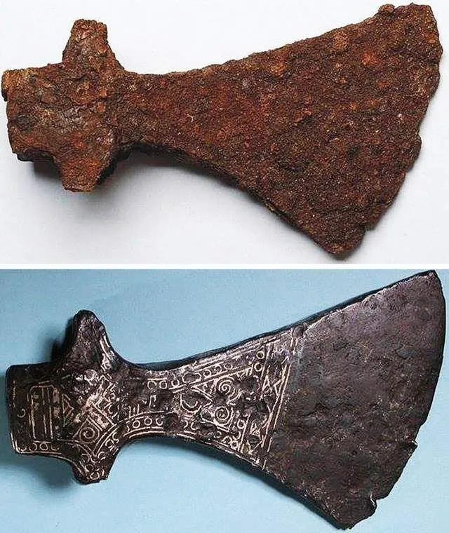 ขวานจากยุคไวกิ้งก่อนและหลังการได้รับการอนุรักษ์ (ขวานมีอายุหว่างศตวรรษที่ 10 และศตวรรษที่ 11)