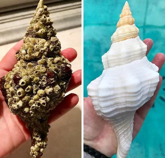 เปลือกหอยก่อนและหลังทำความสะอาด
