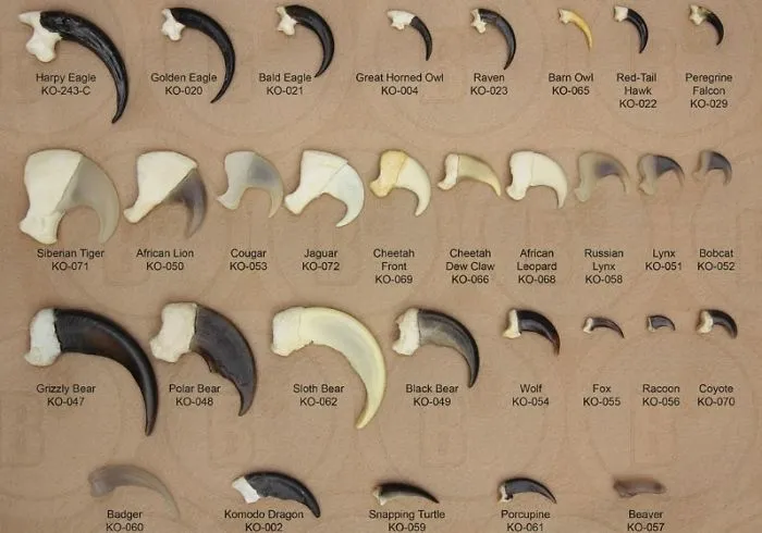2. เปรียบเทียบกรงเล็บ แถวแรกเป็นนกอินทรี นกฮูก อีกา แถวที่ 2 เป็นสายพันธุ์แมว เช่น เสือ สิงโต คูก้า จากัวร์ แถวที่ 3 เป็นพวก หมี หมาป่า และสุดท้ายเป็นพวกสัตว์ครึ่งบกครึ่งน้ำ