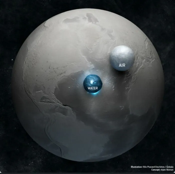 9. ปริมาณน้ำและอากาศบนโลก เมื่อเทียบกับขนาดของโลก