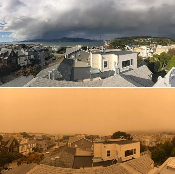 13. เมื่อมองจากบ้านหลังหนึ่งในแคลิฟอร์เนีย วันปกติ vs วันที่เกิดไฟไหม้ป่าครั้งใหญ่