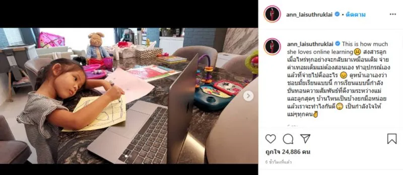 โดย แอน อลิชา ได้โพสต์ภาพการเรียนออนไลน์วันแรกของ น้องริชา บุตรสาว พร้อมแคปชั่นว่า his is how much she loves online learning สงสารบุตรเมื่อไหร่ทุกอย่างจะกลับมาเหมือนเดิม จ่ายค่าเทอมเต็มแม่ต้องสอนเอง ทำอุปกรณ์เองแล้วที่จ่ายไปคืออะไร ดูหน้าเอาเองว่าชอบมั้ยเรียนแบบนี้ การเรียนแบบนี้กำลังบั่นทอนความสัมพันธ์ที่ดีงามระหว่างแม่และบุตรสุดๆ บ้านไหนเป็นบ้างยกมือหน่อย แล้วเราจะทำไงกันดี เป็นกำลังใจให้แม่ๆทุกคน