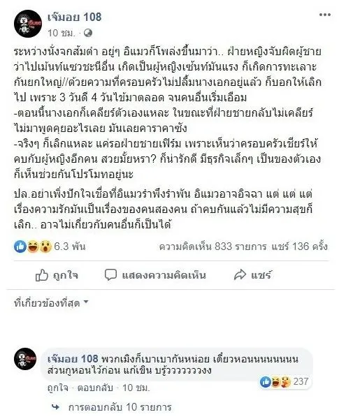 -จริงๆ ก็เลิกแหละ แค่รอฝ่ายชายเฟิร์ม เพราะเห็นว่าครอบครัวเชียร์ให้คบกับผู้หญิงอีกคน สวยมั้ยหรา? ก็น่ารักดี มีธุรกิจเล็กๆ เป็นของตัวเอง ก็เห็นช่วยกันโปรโมทอยู่นะ