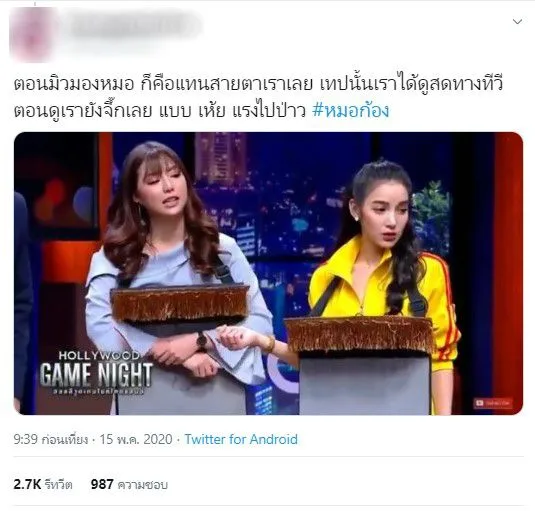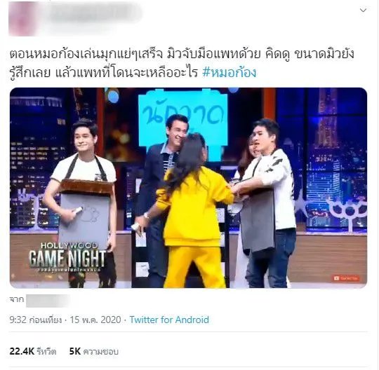 ชาวเน็ตก็ออกมาทวิตข้อความเลยว่า “ตอนหมอก้องเล่นมุกแย่ๆเสร็จ มิวจับมือแพทด้วย คิดดู ขนาดมิวยังรู้สึกเลย แล้วแพทที่โดนจะเหลืออะไร #หมอก้อง” และ ตอนมิวมองหมอ ก็คือแทนสายตาเราเลย เทปนั้นเราได้ดูสดทางทีวี ตอนดูเรายังจึ๊กเลย แบบ เห้ย แรงไปป่าว #หมอก้อง