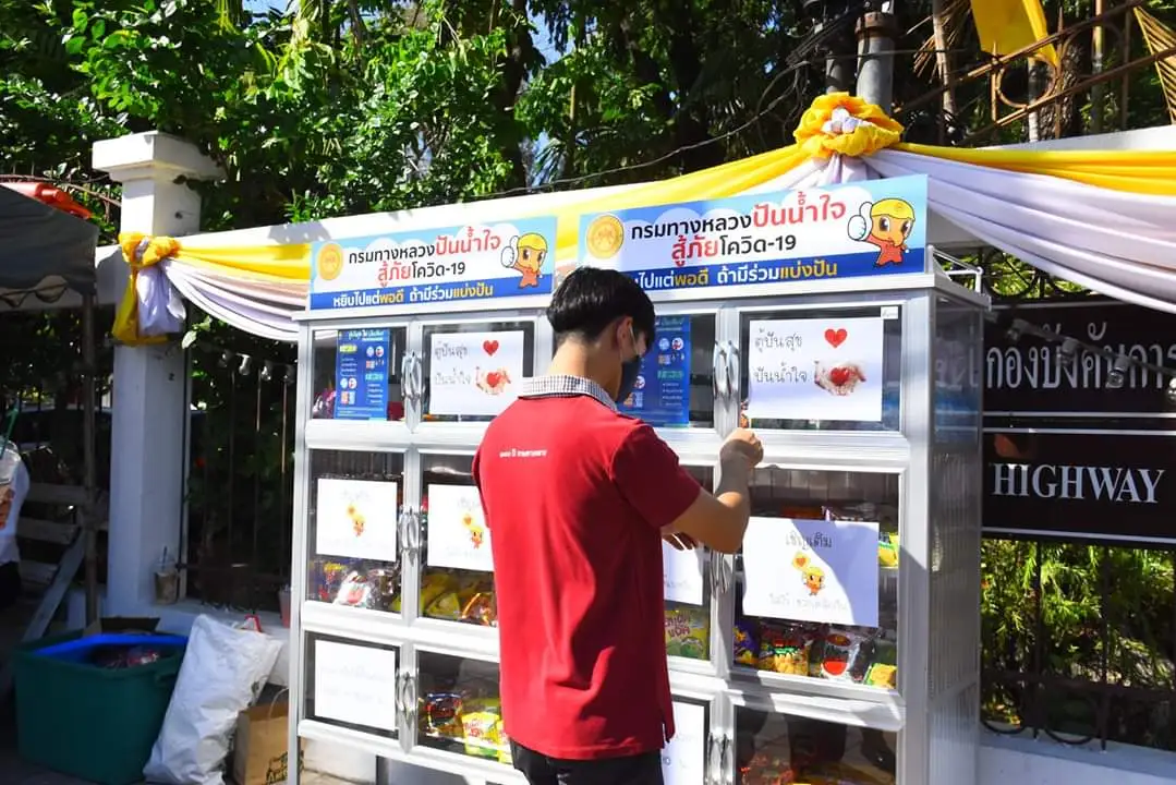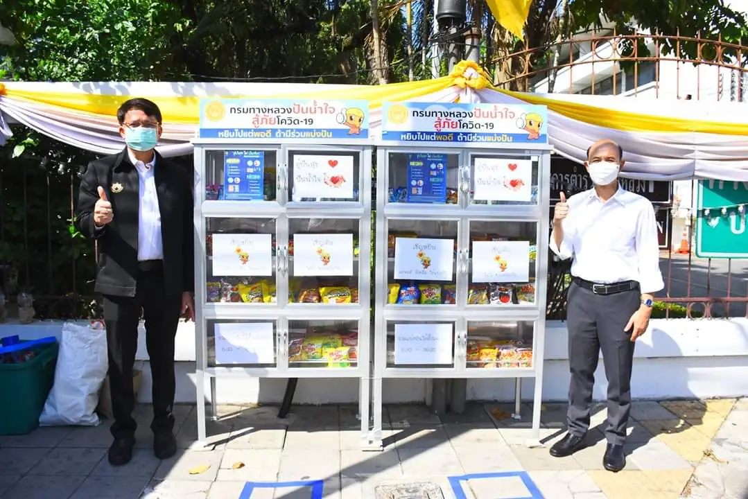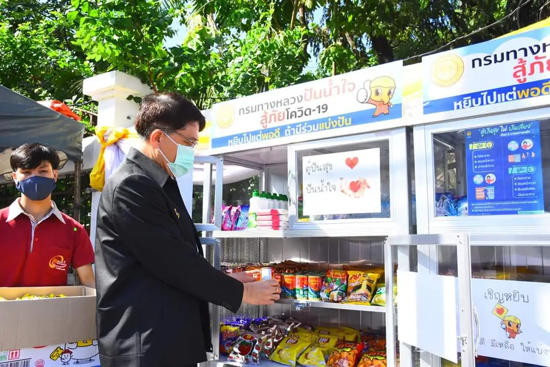 กรมทางหลวง จัดทำและติดตั้ง “ตู้ปันสุข” ตามโครงการกรมทางหลวงปันน้ำใจ สู้ภัยโควิด – 19 เพื่อบรรเทา และช่วยเหลือผู้ที่ได้รับผลกระทบจากการแพร่ระบาดของเชื้อโควิด-19 สำหรับการเปิดตู้ในครั้งนี้นายกิตติพันธ์ ปานจันทร์ รองอธิบดีกรมทางหลวง พร้อมคณะผู้บริหารและเจ้าหน้าที่ร่วมนำสิ่งของใส่ตู้ปันสุข เพื่อเตรียมแจกจ่ายประชาชน เพื่อบรรเทา และช่วยเหลือผู้ที่ได้รับผลกระทบจากการแพร่ระบาดของเชื้อโควิด-19 และหลังจากนี้ เจ้าหน้าที่กรมทางหลวงได้นำสิ่งของอุปโภค บริโภค ที่จำเป็นต่อการดำรงชีวิต มาใส่ไว้ในตู้ปันสุข ในทุกวัน ทั้งนี้สำหรับการติดตั้งตู้ปันสุขดังกล่าวกรมทางหลวงได้ดำเนินการติดตั้งทั้งหมดสาม จุด คือ บริเวณหน้ากรมทางหลวง ถนนศรีอยุธยา เขตราชเทวี กรุงเทพฯ และบริเวณกรมทางหลวงฝั่งถนนพระรามที่ 6 กรุงเทพฯ จำนวน 2 จุดครับ